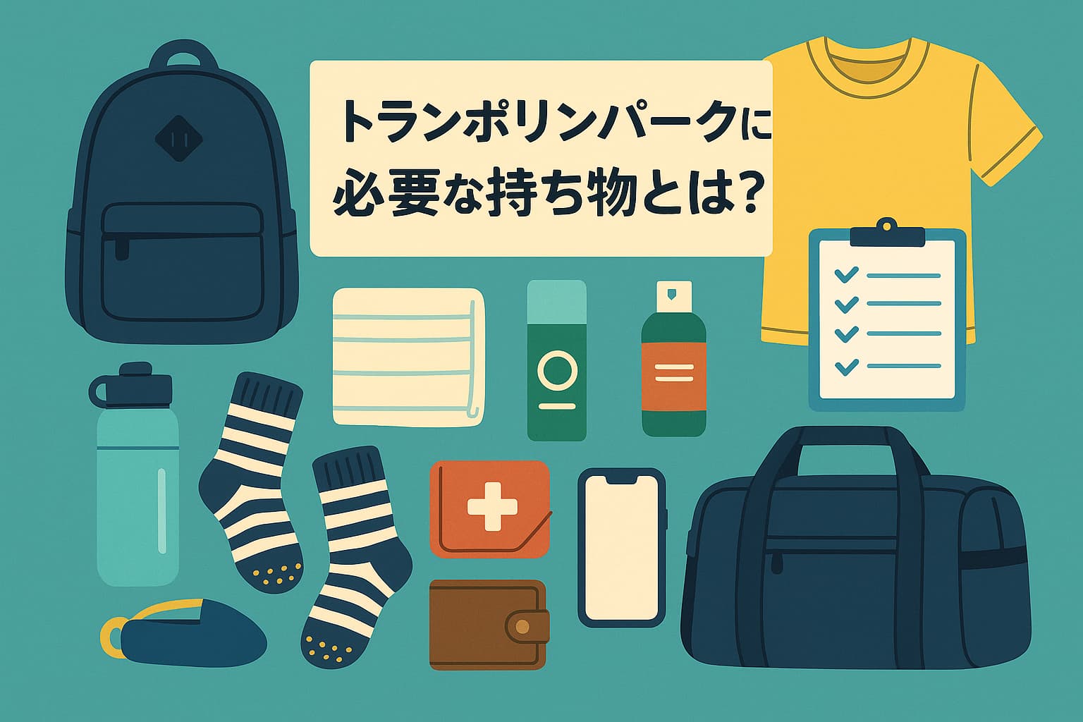 トランポリンパークで必ず必要な持ち物は、動きやすい服装、滑り止め付き靴下、タオル、飲み物、ロッカー用の小銭です。