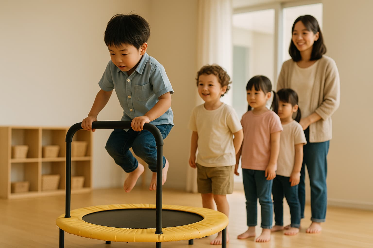 保育園で手すり付きトランポリンを楽しみながら体と心を育てる園児たちの笑顔